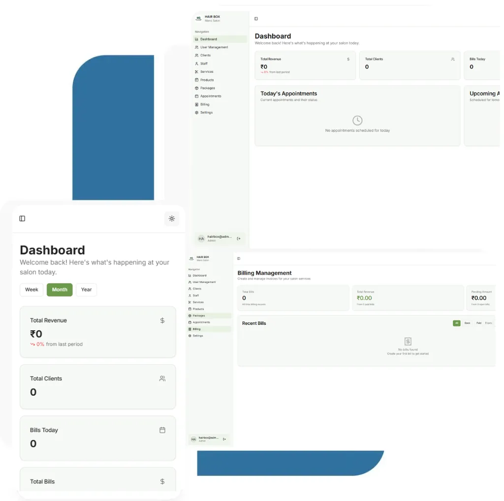 From managing clients and staff to scheduling appointments and billing — our Salon Management App brings your entire salon under one smart dashboard.