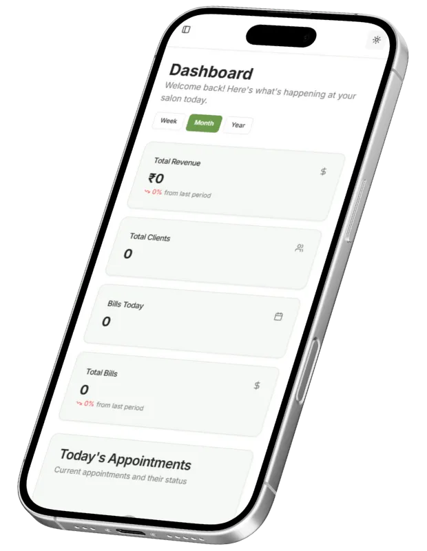 Our Salon App is designed for salon owners, beauty studios, and spas to manage their day-to-day operations with ease.